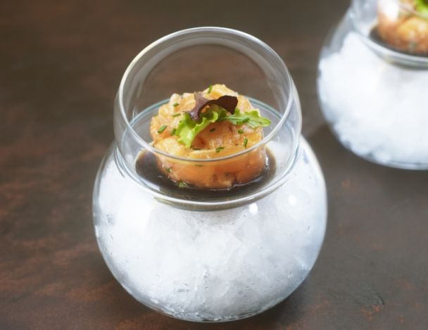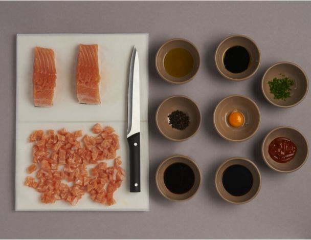 FacileCouper finement le saumon en petits dés, ajouter les jaunes d’œuf, l’huile d’olive, le ketchup, la sauce anglaise, le vinaigre xérès, la sauce soja, la ciboulette, le sel et poivre puis mélanger le tout délicatement. Rectifier l’assaisonnement si nécessaire.