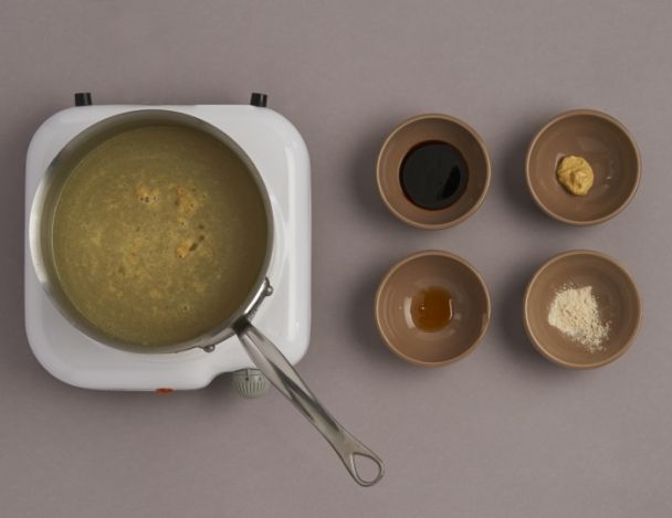 Pour la sauce, chauffer le bouillon de poule puis rajouter la poudre de wasabi, la sauce soja, la moutarde douce et le miel. Bien mélanger puis laisser refroidir.