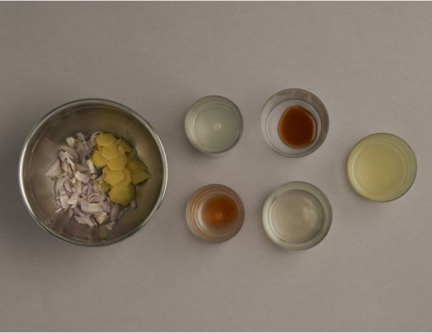 FacileCiseler les échalotes et le gingembre. Presser le jus d'un demi citron, rajouter les huiles, le jus d'huîtres, la sauce worcestershire et le tabasco. Puis réserver.