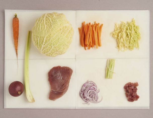 Tailler tous les légumes de la salade en julienne la plus fine possible. Tailler le thon en petits dés de 5mm par 5mm.