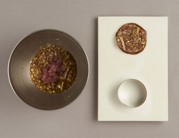 Mélanger le thon avec une petite quantité de marinade, puis rajouter celle-ci au fur et à mesure afin de mettre la bonne quantité (si besoin ne pas utiliser tout le mélange). Cercler directement dans l’assiette les tartares divisés en quatre.