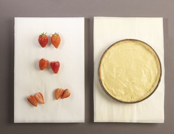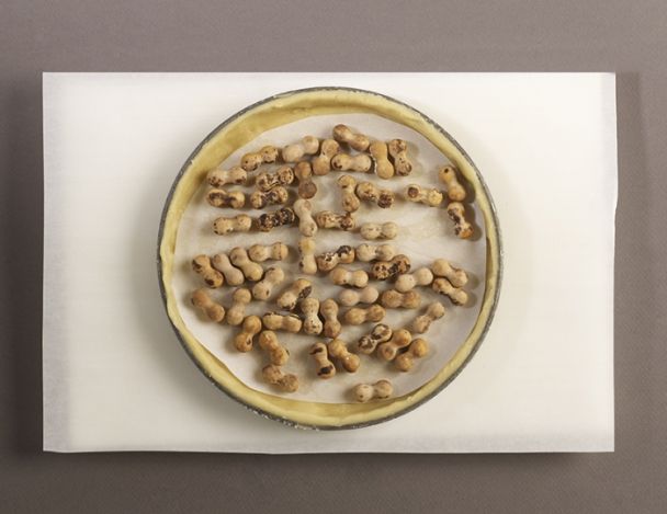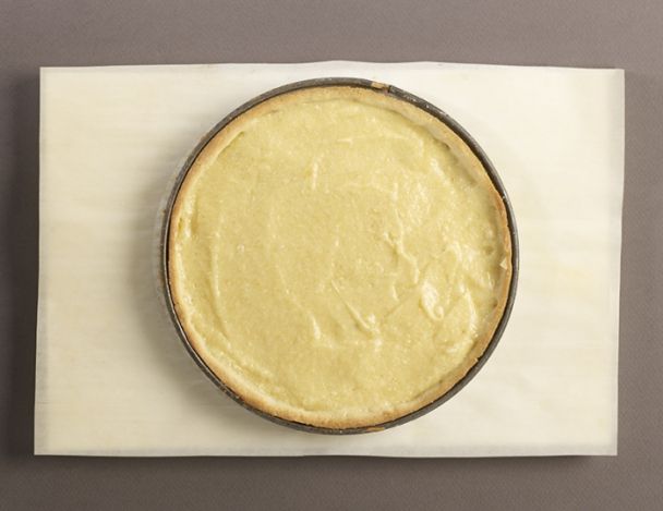 Garnir de pâte sucrée un moule à tarte ou un cercle à pâtisserie posé sur une plaque. Recouvrir le fond de papier sulfurisé, puis répartir sur toute la surface des billes de cuisson ou des haricots secs. Faire cuire 15 minutes au four, puis retirer les billes de cuisson et le papier et laisser refroidir. Ne pas éteindre le four.