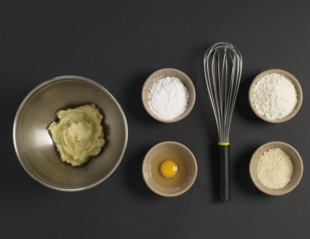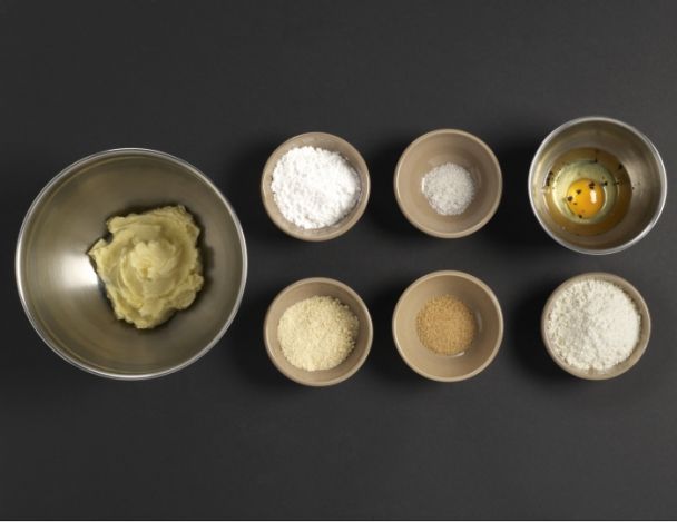 Rendre le beurre pommade. Mélanger le sucre glace avec le beurre. Ajouter les œufs et bien fouetter. Ajouter la poudre d'amande et la farine. Mélanger. Réserver.