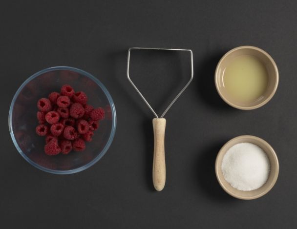 Presser 1kg de framboise pressées, le sucre et le jus de citron et placer dans une sorbetière.