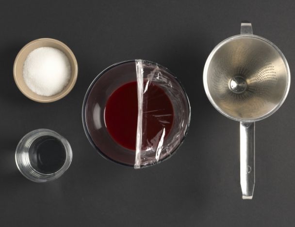 Détendre de la pulpe de cassis avec un peu d'eau et du sucre. Filmer la préparation. Et mettre au frais pendant 2h. Puis passer au chinois étamine sans presser. Réserver au frais.
