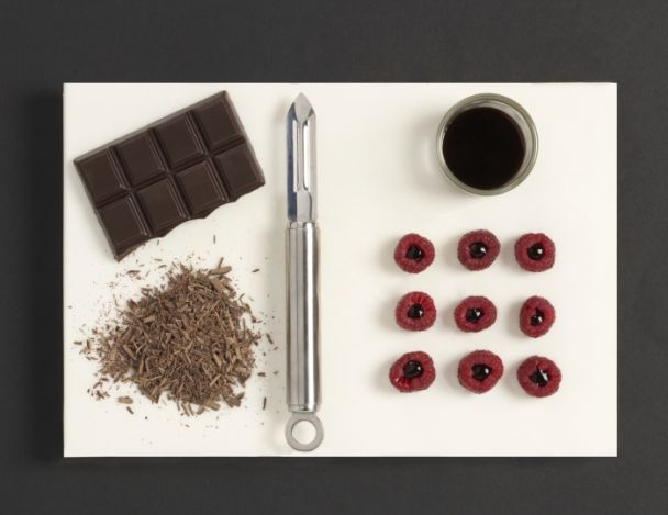 Réaliser des copeaux de chocolat noir. Remplir les framboises de coulis de cassis.