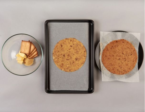 MoyenDans un saladier, émietter les biscuits en gardant quelques morceaux gros de 2/4 mm maximum. Faire chauffer le beurre jusqu’à l’obtention d’une texture très molle mais surtout pas fondue, puis ajouter le sucre et le beurre aux biscuits broyés. Mélanger à la main.