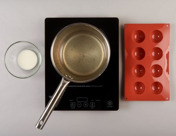 Placer des cuillères à café dont vous aurez filmé le creux, sur une plaque allant dans votre congélateur. Ces cuillères doivent être bien droites pour pouvoir couler la préparation au citron dans le creux et réalisez ainsi des inserts plutôt plats, à raz de la cuillère (si vous avez des petits moules en silicone demi sphériques remplissez-les au tiers et placez-les au congélateur).
