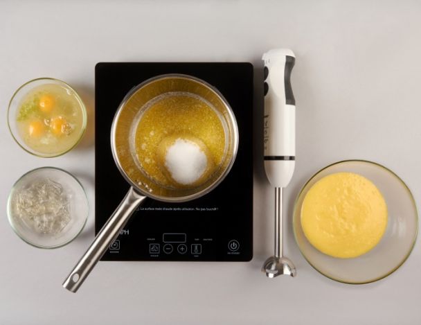 Mixer la crème citron à l’aide d’un mixeur plongeant pour obtenir une crème lisse et soyeuse. Filmer au contact et réserver au réfrigérateur 3 heures.
