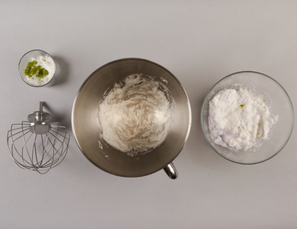 Placer la cuve sur le batteur de table avec le fouet. Fouetter alors jusqu’à ce que la meringue soit revenue à température ambiante. A l’aide d’une Maryse, incorporer délicatement le sucre glace restant, le zeste de citron vert et la fleur de sel. Filmer et réserver.