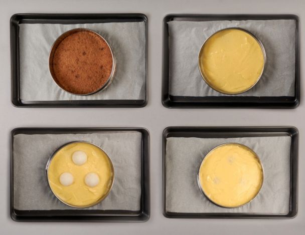 A l’aide d’une cuillère, étaler la crème au citron sur la pâte friable toujours en cercle, sur 1cm de hauteur et placer en triangle 3 inserts congelés sur la crème (2 pour les petites tartelettes).