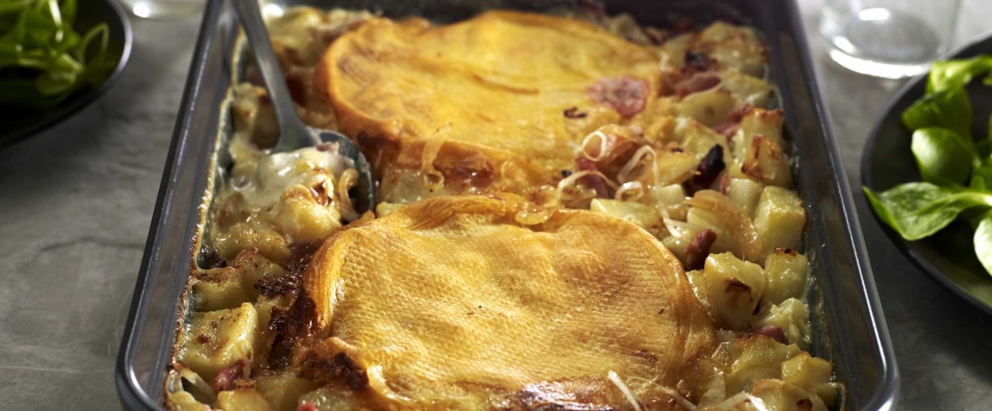 Couper le reblochon en deux dans l'épaisseur. Disposer les pommes de terres, les lardons et les oignons dans un plat à gratin, ajouter la crème et le vin blanc. Disposer les deux faces du reblochon, croute sur le dessus. Et enfourner 20 minutes à 180°C jusqu'à ce que le dessus soit bien gratiné.