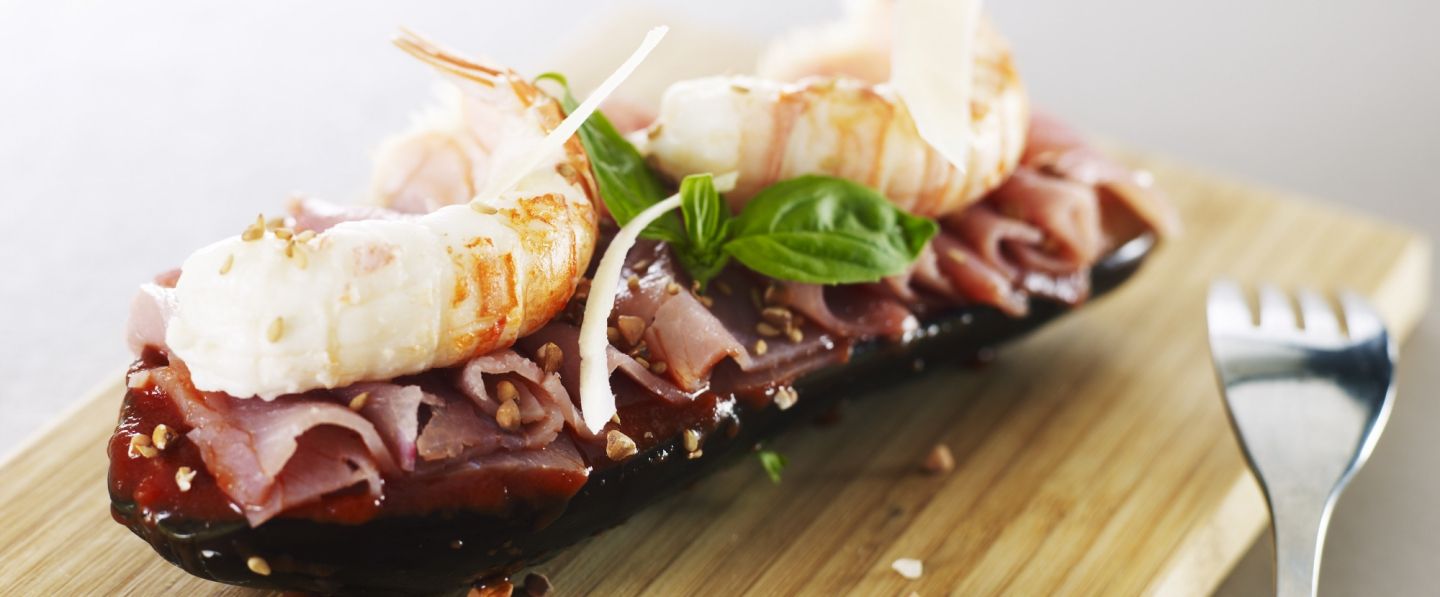 Tartiner l’aubergine de tomate. Poser les langoustines, ajouter le parmesan, le jambon. Finition avec du basilic, le parmesan et les graines torréfiées de blé noir.