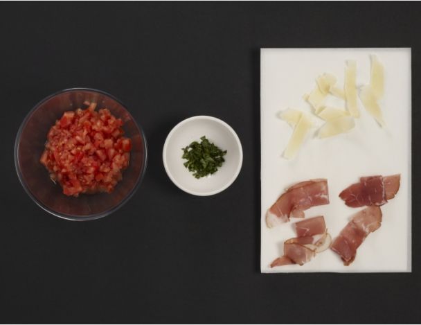 FacileFaire concasser les tomates. Faire des copeaux de parmesan et de jambon. Ciseler le basilic puis l’ajouter aux tomates.