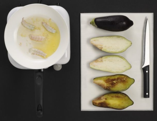 Couper les aubergines dans la longueur, colorer, réserver. Décortiquer les langoustines. Cuire les langoustines 2 minutes au beurre avec l’ail.
