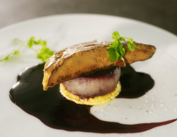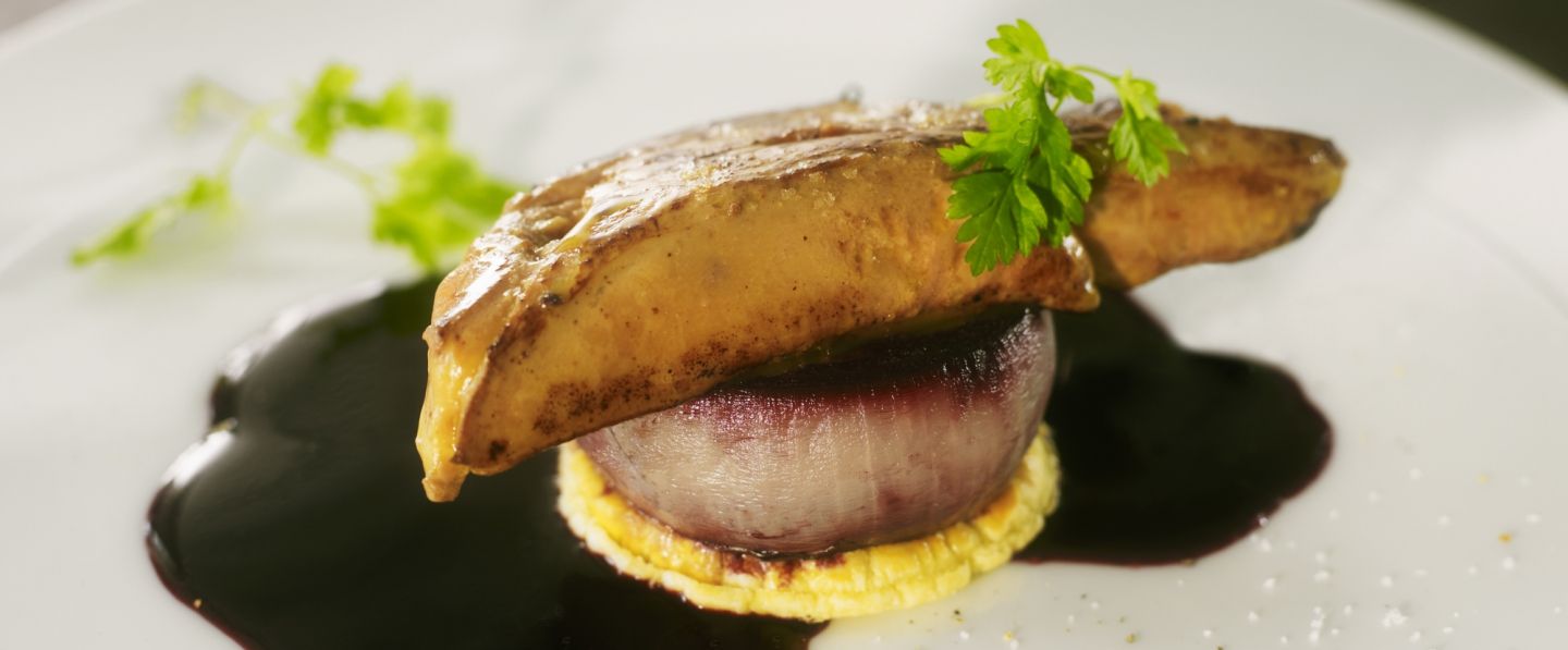 Verser un fond de sauce dans chaque assiette. Déposer au centre un croustillant, un oignon, et pour finir une tranche de foie gras. Parsemer de fleur de sel et de poivre concassé et déguster aussitôt.