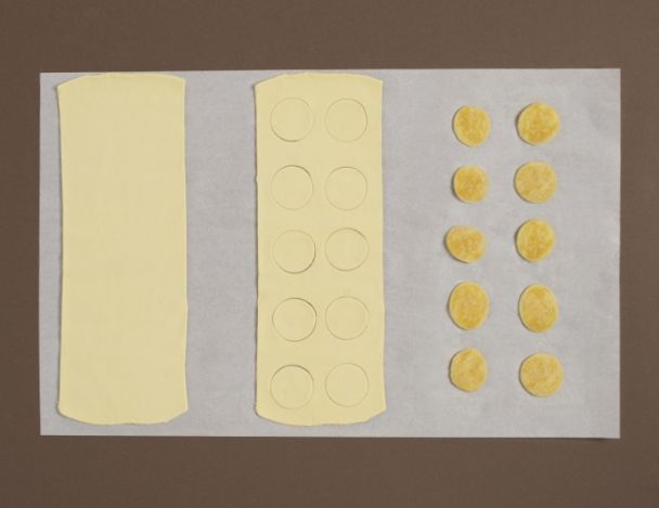 Préchauffer le four à 180°C (th 6). A l'aide d'un emporte-pièce du diamètre des oignons (ou avec un verre retourné) découper des ronds dans la pâte feuilleté déroulée.