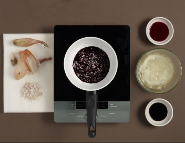 Délayer le fond de veau dans 50cl d'eau. Peler et hacher les échalotes. Les faire cuire dans le vin rouge avec une pincée de sel et de sucre jusqu'à absorption totale du liquide. Ajouter le fond de veau et laisser cuire 10 minutes. Au dernier moment, ajouter le vinaigre balsamique et la crème de cassis.
