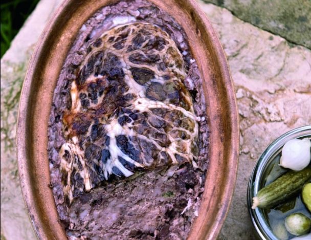 Remplissez la terrine avec cet appareil, déposez 2 feuilles de laurier, recouvrez de crépine.