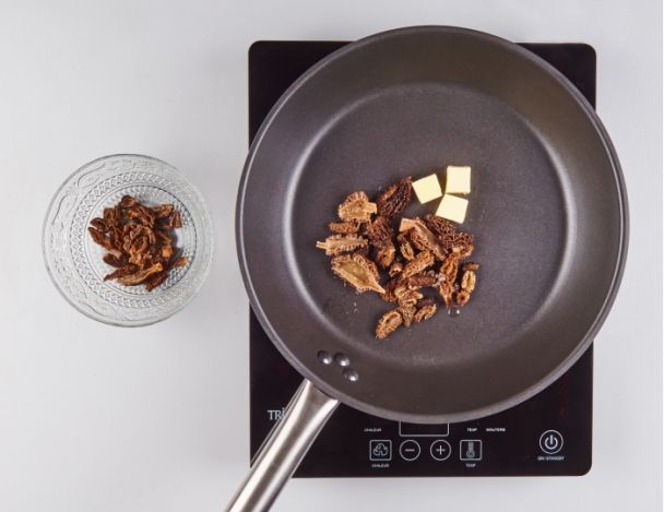 Nettoyer les morilles, puis les couper en deux. Faire revenir les morilles 5 minutes dans 20g de beurre.