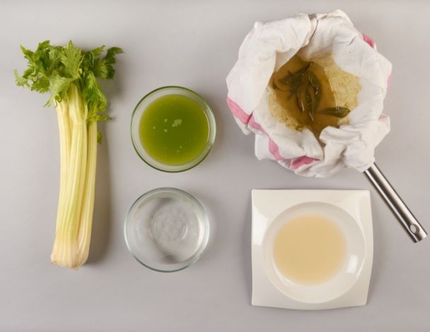 Passer les céleris branches à l'extracteur de jus ou au blender, chauffer le jus pour le décanter, filtrer au torchon et infuser à la verveine. Ajouter la gélatine et couler le jus dans des assiettes creuses, réserver au froid.