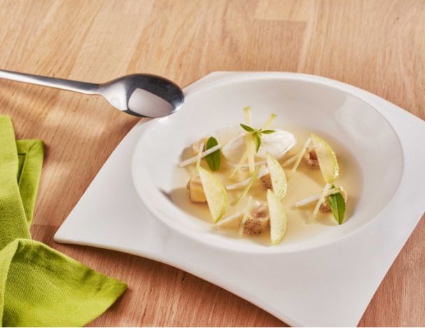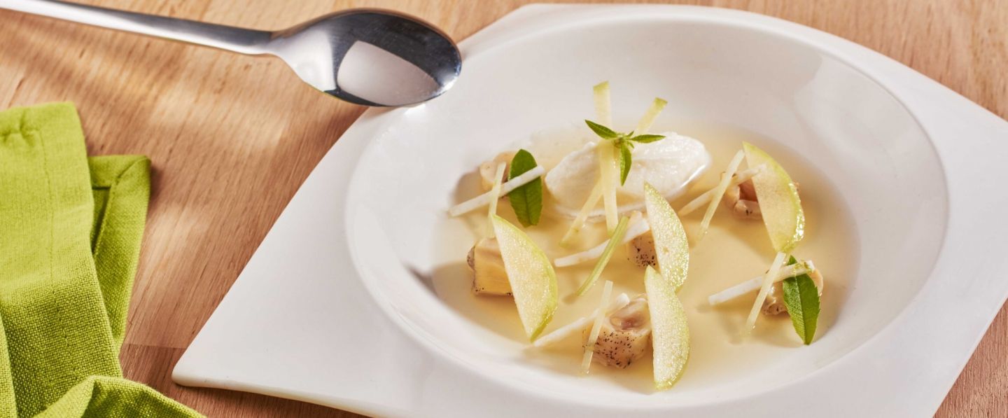 Une entrée légère, au fumet de coquillages, et de céleri. On découvre dans cette recette un mélange de textures : de la mousse de céleri au croquant des pommes vertes, de quoi épater vos convives !