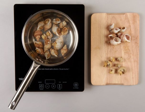 MoyenCuire les bulots dans l’eau bouillante pendant 20 minutes puis laisser refroidir dans l’eau de cuisson. Décortiquer et nettoyer.