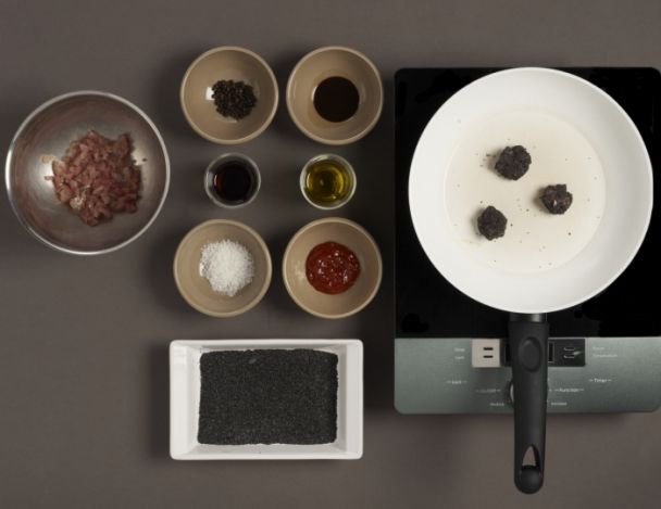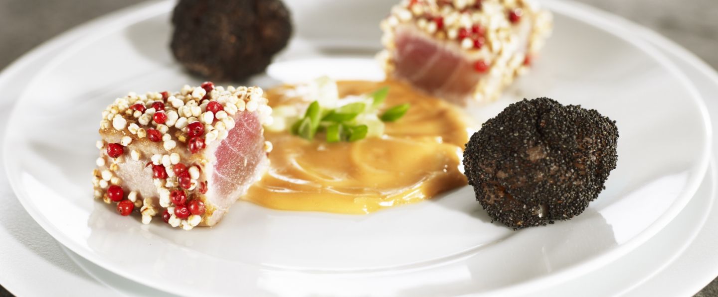 Couper en petits dés les parures de thon puis assaisonner de sel et poivre, ketchup, sauce anglaise, huile d’olive et vinaigre xérès. Former quatre belles boules et les paner dans le pavot préalablement torréfié.