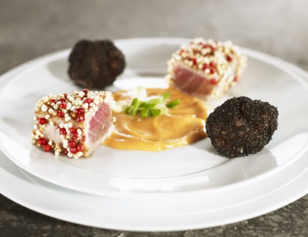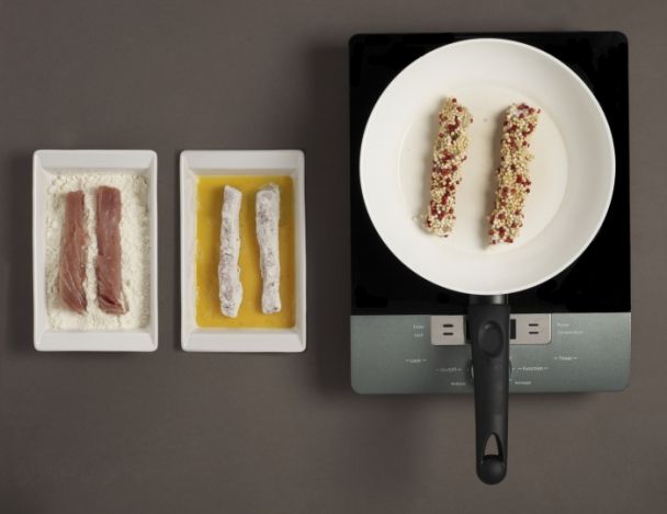 FacileParer le thon et tailler quatre beaux bâtonnets de thon rouge, les assaisonner et les paner à l’aide de farine et de l’œuf battu dans un mélange de quinoas soufflés et de poivre de baies roses. Au dernier moment, les rôtir dans l’huile d’olive en respectant la cuisson (rosé à cœur).
