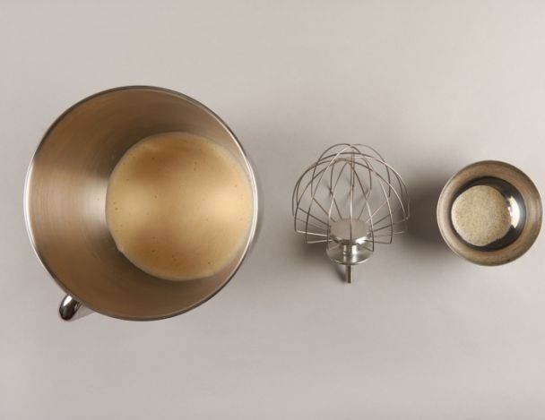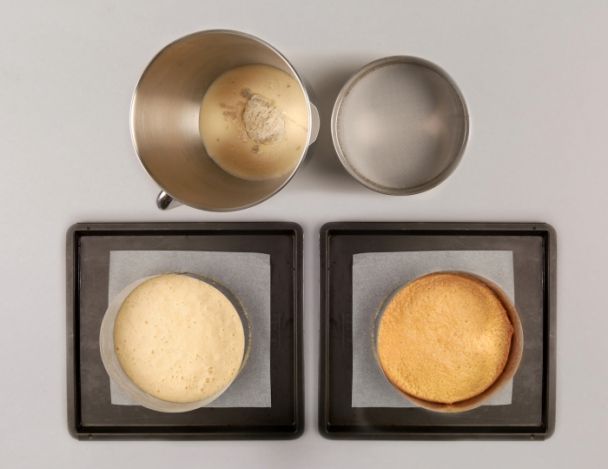 Incorporer ensuite la farine et la fécule préalablement tamisées ainsi que la fleur de sel à l’aide d’une maryse. Verser l’appareil dans un moule à génoise de 20 cm de diamètre, préalablement beurré et fariné. Faire cuire 12 min à 170°C.