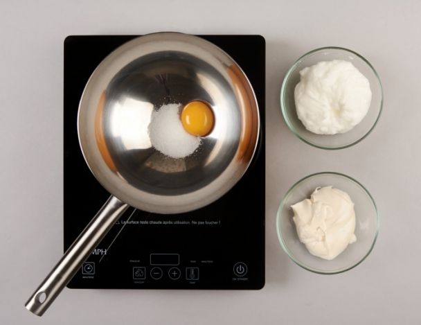 Dans un petit saladier, mélanger le jaune d’œuf avec le sucre semoule (sabayon). Faire cuire ce sabayon au bain marie, mélanger sans cesse le jaune d’œuf avec une maryse jusqu’à ce qu’il épaississe. Ajouter ensuite le sabayon, le blanc d’œuf monté et la crème montée à la crème mascarpone.