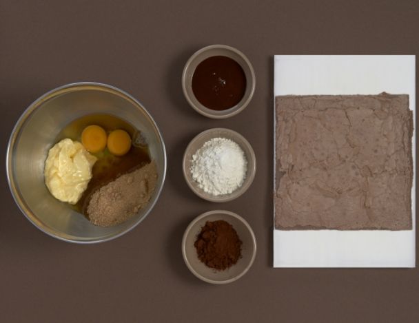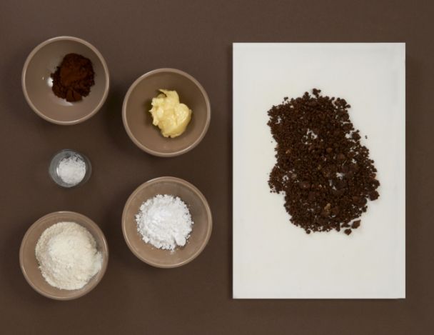 DifficileBattre au batteur le beurre et le sucre brun et incorporer les œufs entiers et battre au maximum pendant 10 minutes, afin d’obtenir une base ferme et moussante. Ajouter le chocolat noir fondu doucement et terminer avec la farine et le cacao. Mettre en moule et étaler la pâte pour avoir 1 cm d’épaisseur. Cuire au four à 180°C pendant 7 minutes. Mettre au congélateur pour l’utilisation.