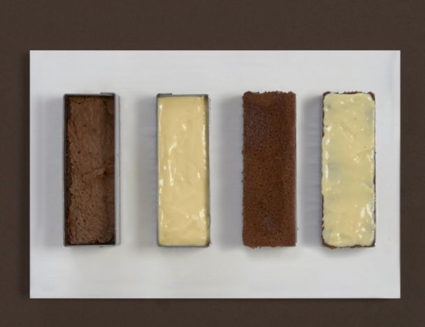 Dans un cadre flexible, ajouter le cake au chocolat coupé en deux et imbiber un peu de café à l’aide d’un pinceau. Ajouter la crème de Mascarpone d’un demi cm d’épaisseur. Laisser prendre au congélateur. Redéposer l’autre moitié du cake chocolat par-dessus et rajouter un cm d’épaisseur de la crème mascarpone restante. Mettre au congélateur jusqu’à ce que le résultat soit complétement gelé. Retirer le cadre et découper des barrettes de 3 cm sur 14 cm et réserver au frigo.
