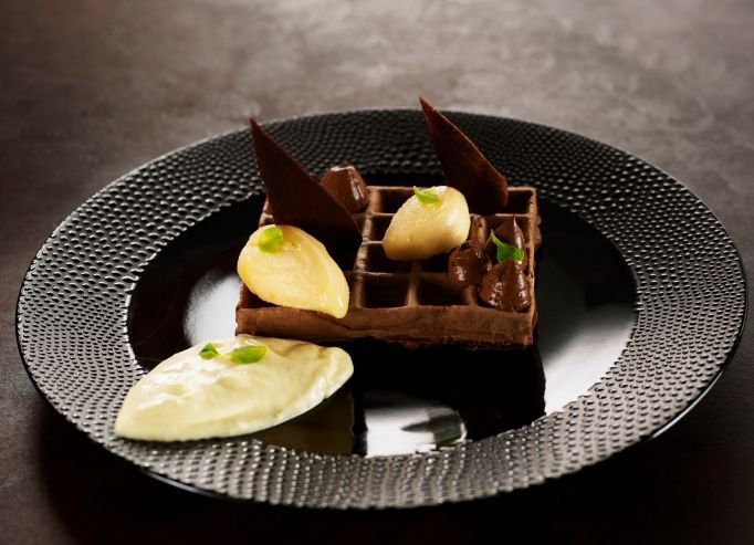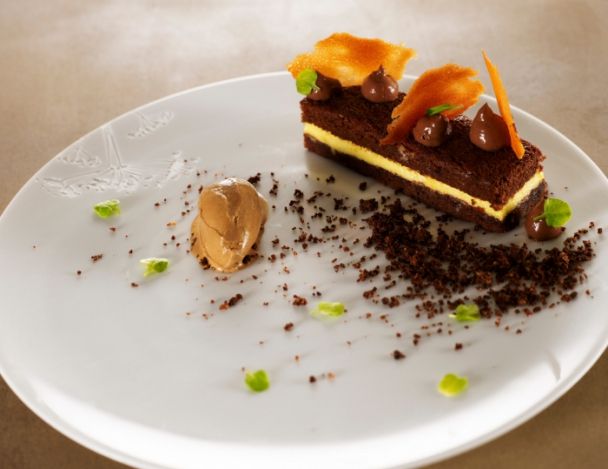 Disposer la barrette de tiramisu sur l’assiette et jeter un peu de crumble à l’aide d’une cuillère. Faire des points de chocolat sur la barrette et ajouter les boules de glace café, les morceaux de tuile de cigarette Russe et terminer avec le ghoa cress.