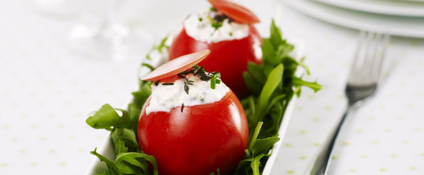 Laver les tomates, les creuser et les farcir de fromage aux aromates.Arrosé d'huile d'olive et servir.