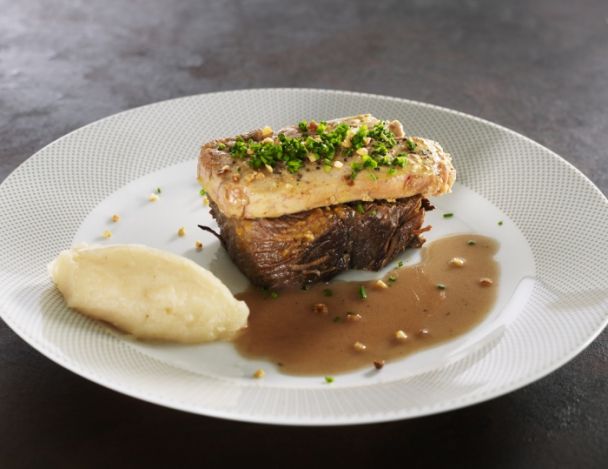 Poser les tournedos sur assiette recouverts d’une escalope de foie gras sur laquelle on parsème un peu de ciboulette fraichement ciselée et quelques cacahuètes grillées concassées.