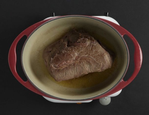 DifficileFaire parer et ficeler le paleron par votre boucher. Colorer la viande au beurre clarifié dans une cocotte en fonte. Réserver et dégraisser le récipient.