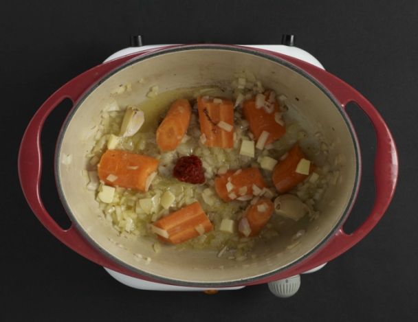 Ajouter le beurre entier et laisser blondir les aromates doucement afin de sucrer la garniture. Ajouter le concentré de tomate et faire légèrement pincer c'est à dire cuire pour enlever une partie de l'acidité.