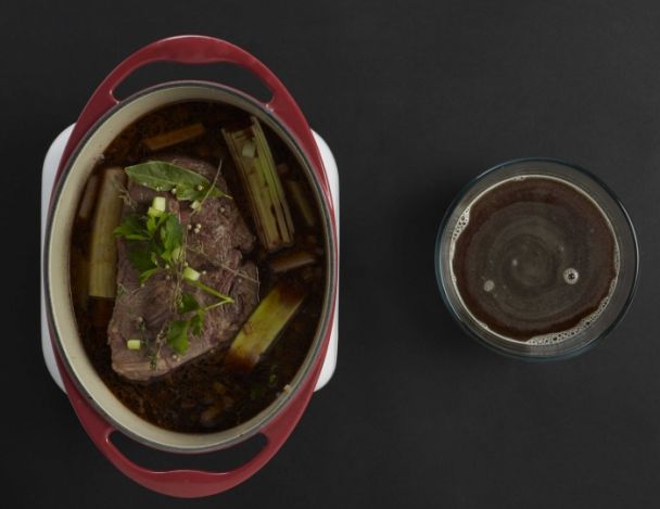 Remettre la viande et déglacer avec le vin rouge. Puis la flamber. Ajouter le bouquet garni compose du céleri, poireau, thym, laurier et queues de persil. Mettre également les épices. Mouiller à hauteur avec le fond brun de veau et cuire à four doux 160°C durant 4 heures.