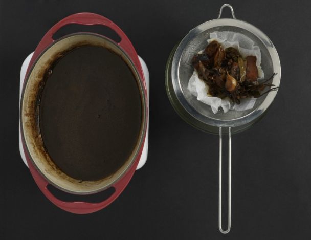 Débarrasser délicatement la viande et passer la sauce au chinois étamine. Réduire la sauce afin qu'elle s'épaisisse et nappe légèrement, puis rectifier l’assaisonnement.