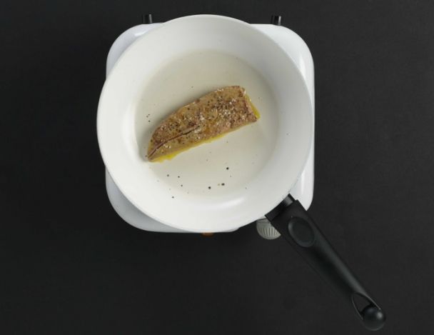 Poêler sans excès les escalopes de foie gras préalablement assaisonnée de poivre concasse et fleur de sel en tapotant légèrement pour faire rentrer l’assaisonnement.