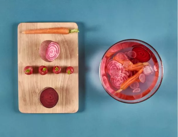 Faire de très fins copeaux des ingrédients avec une mandoline chinoise, puis placer les copeaux dans de l'eau glacée.