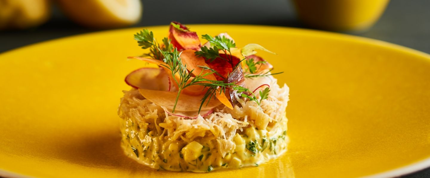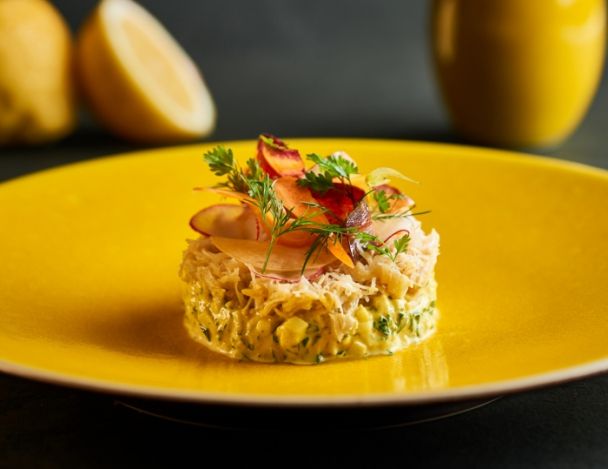 Dans un cercle rond, disposer dans un premier temps la remoulade de céleri, ajouter la chair de tourteau et parsemer des œufs de harengs fumés.