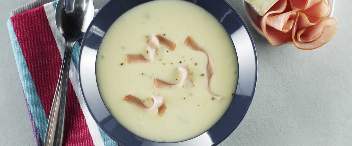 Couper le bacon en petits morceaux. Déposer les morceaux dans les assiettes et servir le velouté.