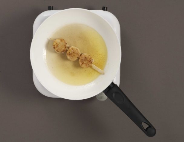 Rincer les noix de Saint-Jacques, puis les éponger sur un linge sec. Sur un pique en bois suffisamment long pour y mettre de deux ou trois noix, piquer les noix, les saler à la fleur de sel. Puis les dorer dans le beurre restant mousseux en leur donnant une coloration blonde sans les agresser par la chaleur.