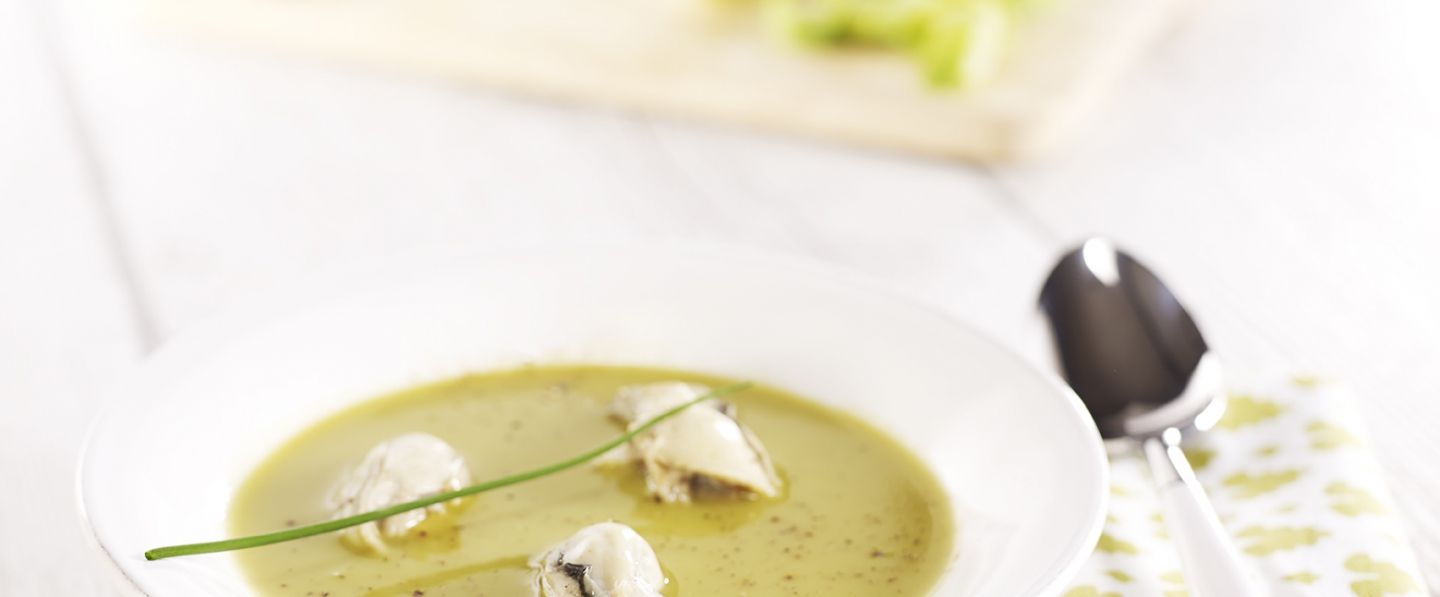 Au moment de servir, déposer 3 huîtres (sans coquille) au fond de chaque assiette creuse puis ajouter le velouté. Décorer avec un brin de ciboulette et déguster aussitôt.