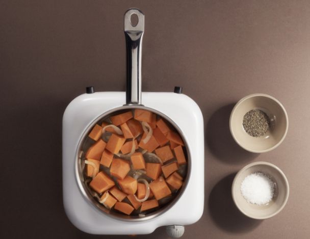 FacileEplucher et émincer les oignons. Eplucher et tailler en cube le potiron. Faire revenir les oignons dans une cuillère de beurre, ajouter les dés de potiron. Mouiller à l'eau à mi-hauteur et assaisonner avec du sel et du poivre. Laisser cuire à couvert pendant 20 min.