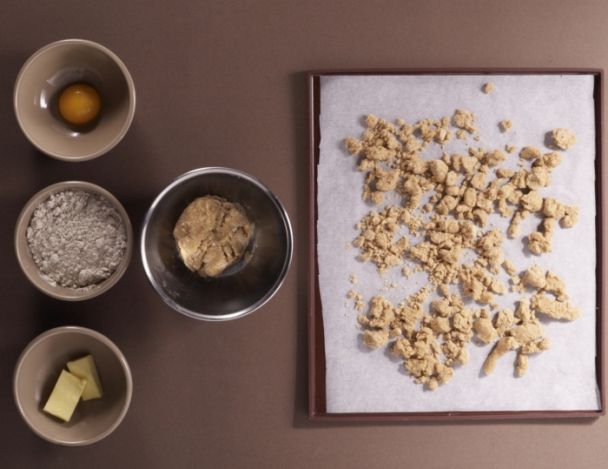 Effriter cette pâte sur une plaque recouverte d'un papier sulfurisé et enfourner à 180°C pendant 10min.