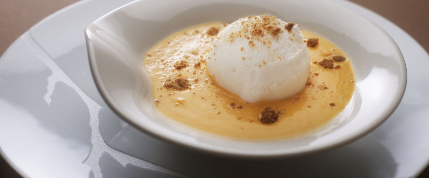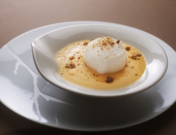 Faire une boule de glace de chèvre et la déposer au centre. Soupoudrer de crumble de châtaigne.