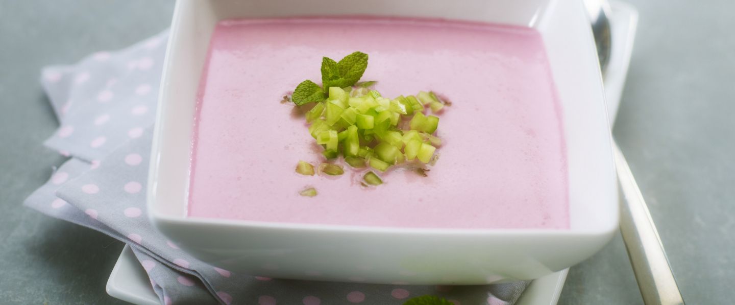 La recette de velouté glacé de concombre et betterave au chèvre frais est une entrée colorée, légère et rafraichissante que l'on adore déguster lorsque le soleil brille plus fort et que les jours commencent à s'allonger.